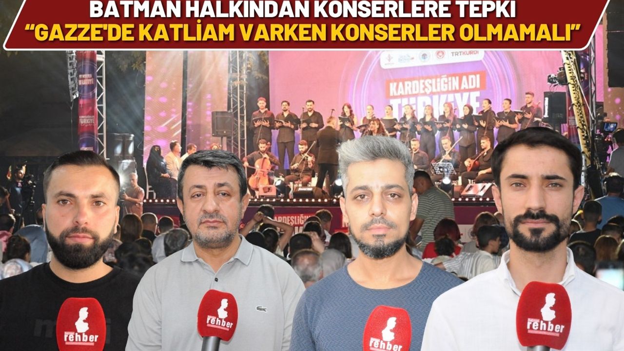Batman Rehber gazetesi mikrofonuna konuşan vatandaşlar, Gazze'de yaşananlar ve kentin mevcut sorunlarına dikkat çekerek konserlerin yapılmaması gerektiğini vurguladı. Halk, bu tür etkinliklerin hem vicdanlara aykırı olduğunu hem de kamu kaynaklarının israfına yol açtığını belirtti.