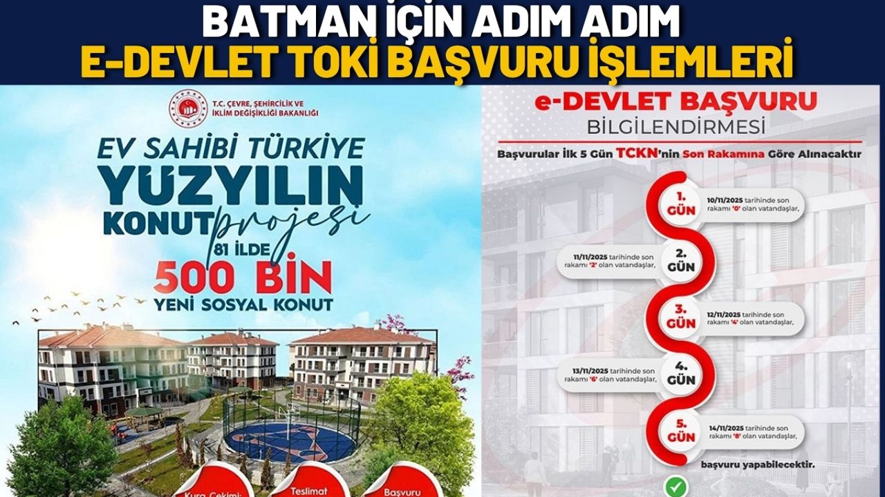 Batmanlı vatandaşlar, “Ev Sahibi Türkiye” projesi kapsamında TOKİ tarafından yapılacak 3 bin 810 konut için başvuru sürecine yoğun ilgi gösteriyor. E-Devlet üzerinden yapılacak başvurular için adımlar, şartlar, fiyatlar ve özel kontenjanlar netleşti.