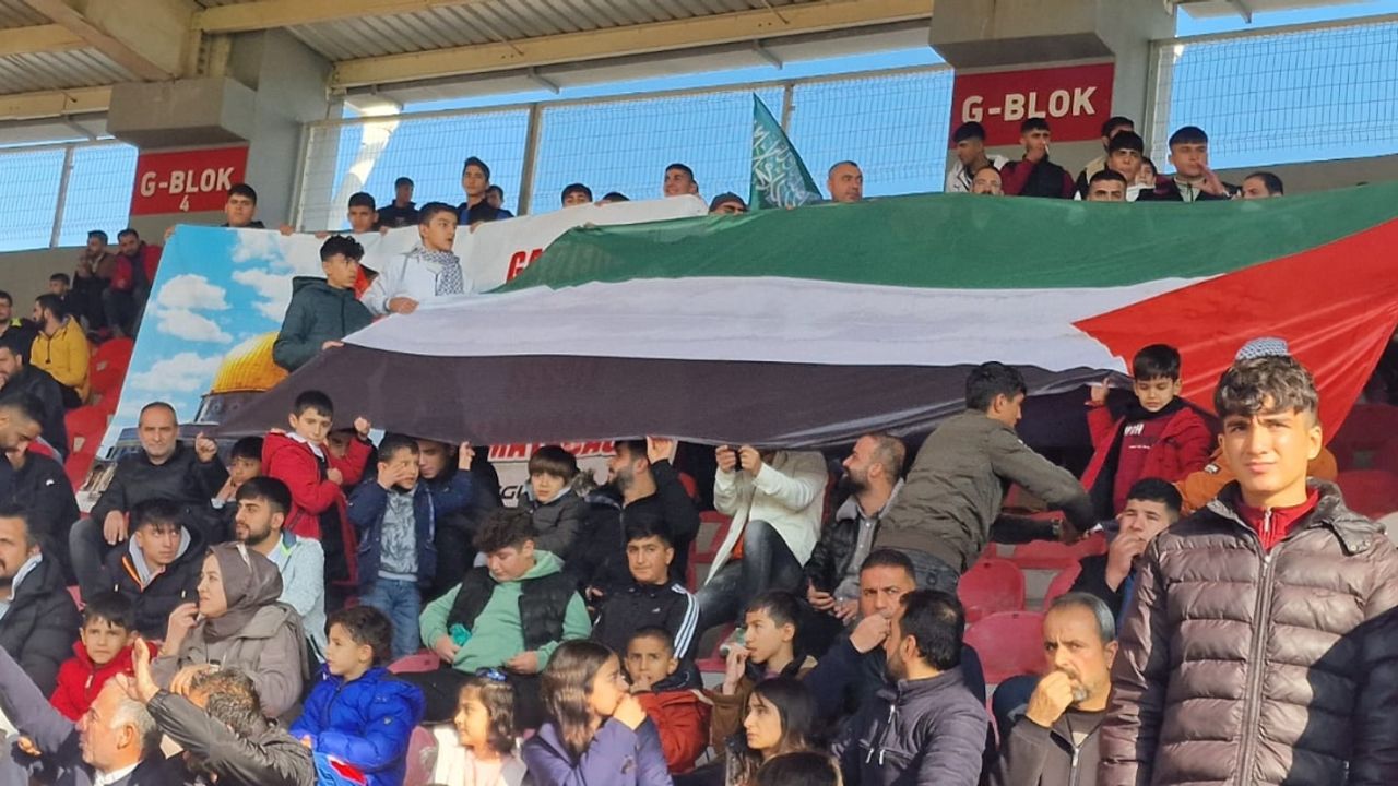 Tribünlerde Batman Petrolspor taraftarları Gazze'deki direnişe destek kapsamında Filistin bayrakları açarak katil İsrail aleyhinde slogan attılar. MUHARREM KAYIK