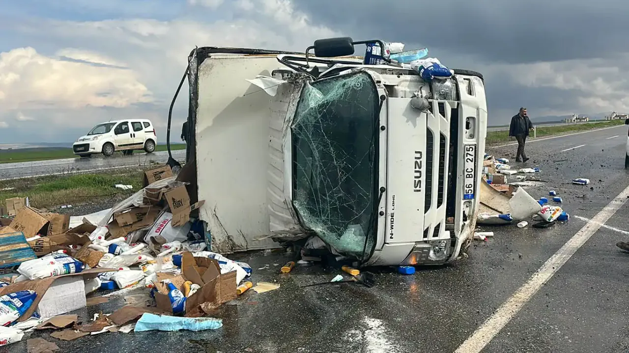 Kaza sonrası yola savrulan temizlik malzemeleri ve kamyoneti