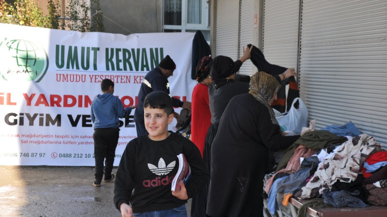beraber sahada bulunan Umut Kervanı, yiyecek ve giyim başta olmak üzere sel
