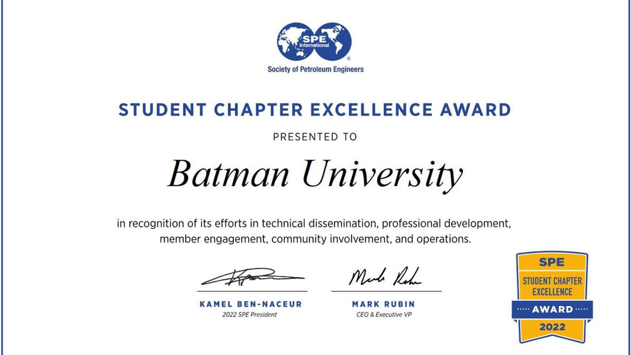 oluşturduğu Batman University Student Chapter topluluğuna ikinci defa layık
