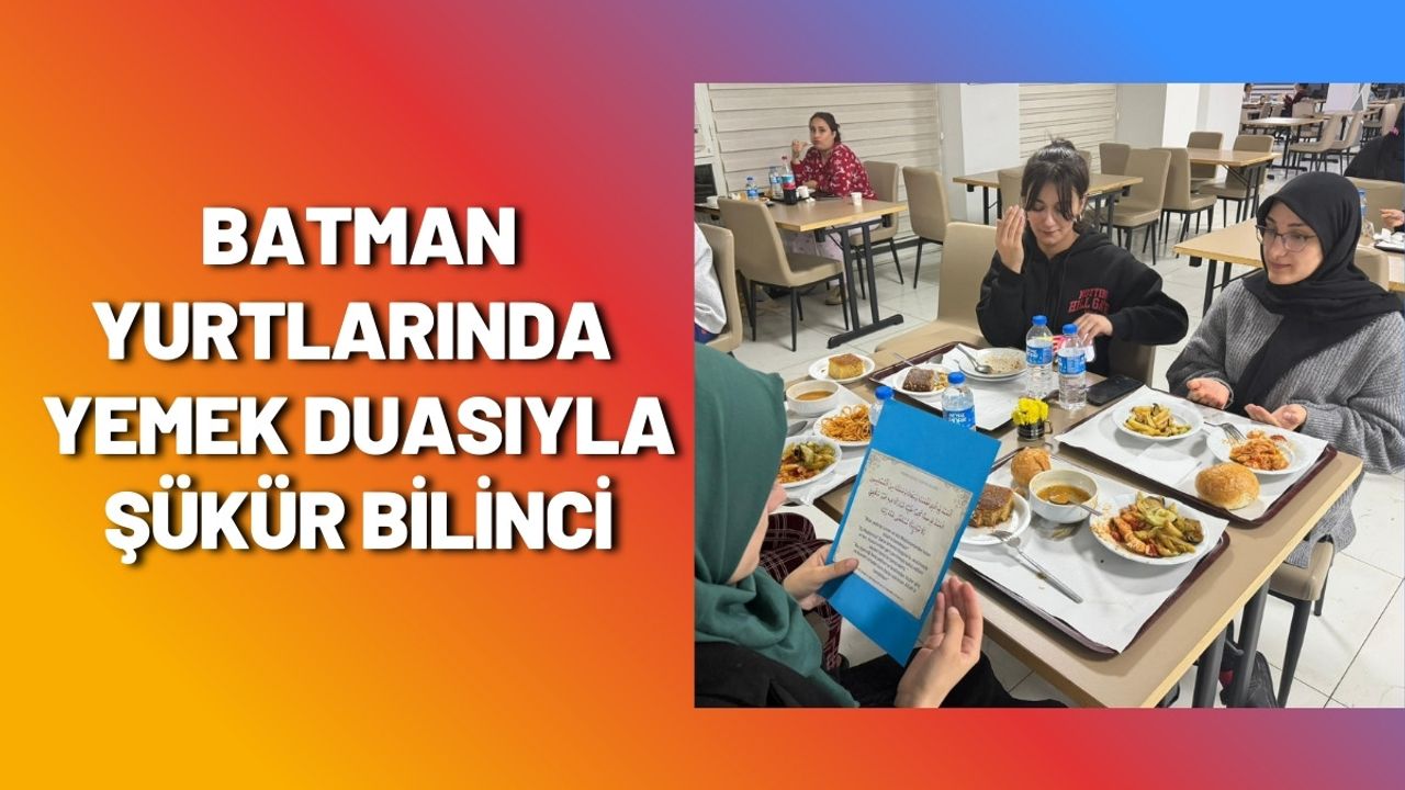 Gençlik ve Spor Bakanlığı tarafından bu yıl başlatılan uygulama, Batman’daki yurtlarda da öğrencilerin katılımıyla sürdürülüyor. Yemek saatlerinde yemekhanede bulunan öğrencilerden biri gönüllü olarak dua ediyor, diğer öğrenciler de bu duaya eşlik ederek toplu bir şükür ve paylaşım ortamı oluşturuyor.