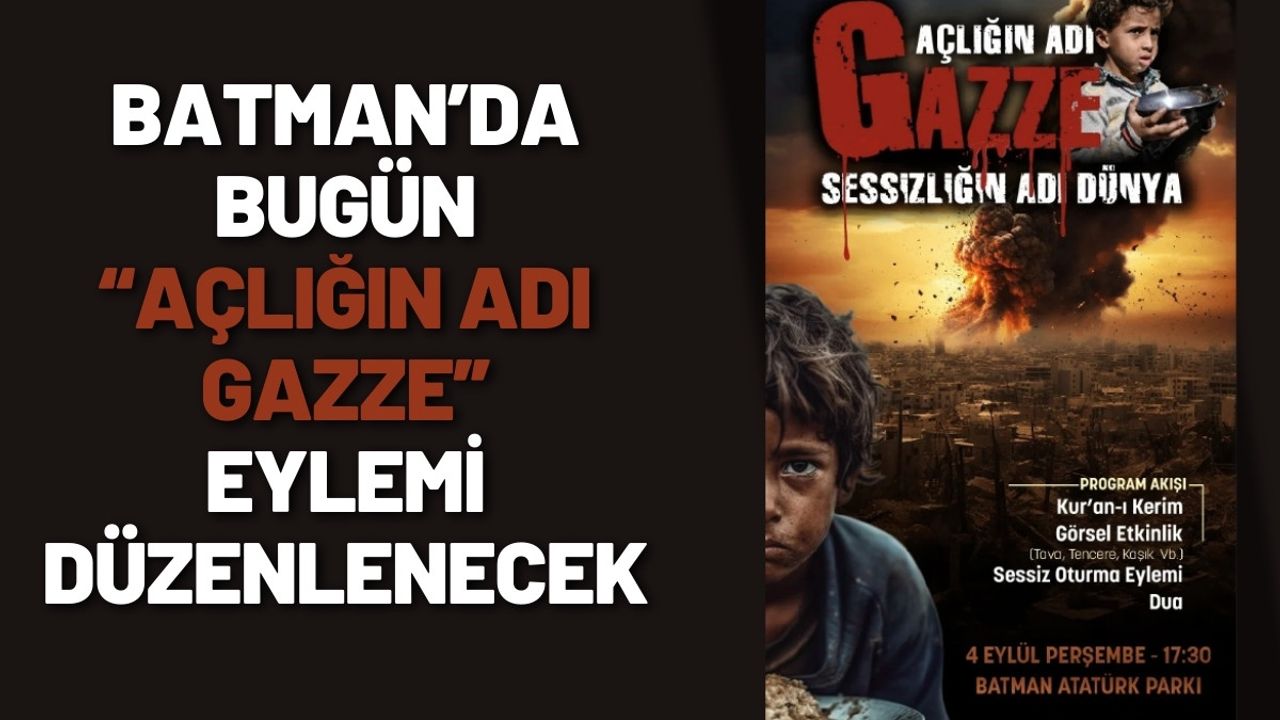 Bu sessizliğe dikkat çekmek amacıyla Batman’daki sivil toplum kuruluşları, “Açlığın adı Gazze, sessizliğin adı dünya” temasıyla anlamlı bir eylem gerçekleştirecek. Etkinlikte Gazze’deki insani krize dikkat çekilirken, açlık nedeniyle hayatını kaybeden çocukların dramı da gündeme taşınacak.