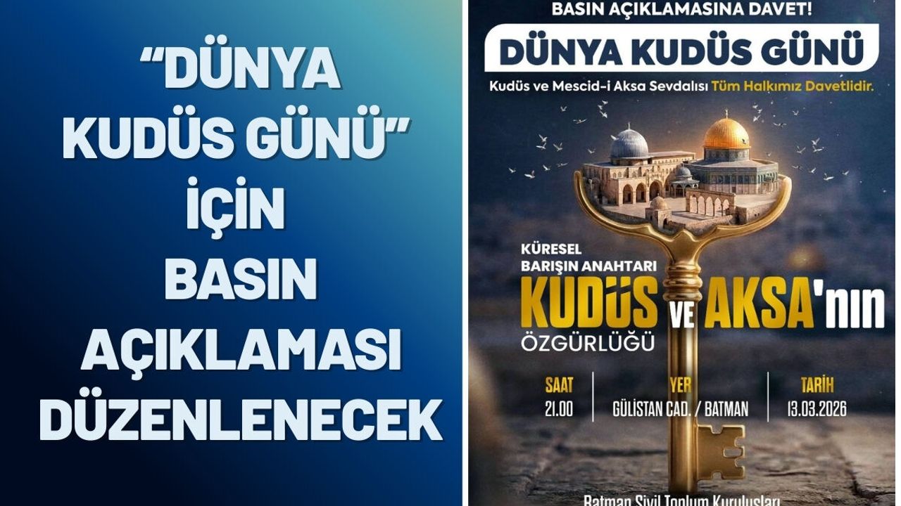 Batman’da yapılacak basın açıklamasında da Kudüs’ün barışın anahtarı olduğu mesajının verilmesi ve Mescid-i Aksa’nın özgürlüğüne dikkat çekilmesi bekleniyor.