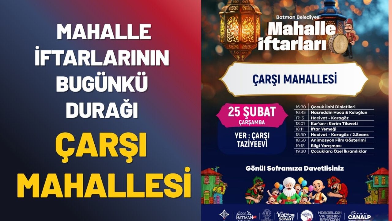Batman Belediyesi'nin kentin farklı noktalarında organize ettiği mahalle iftarları programı devam ediyor. Yapılan duyuruya göre, etkinliklerin bugünkü adresi Çarşı Mahallesi olacak.