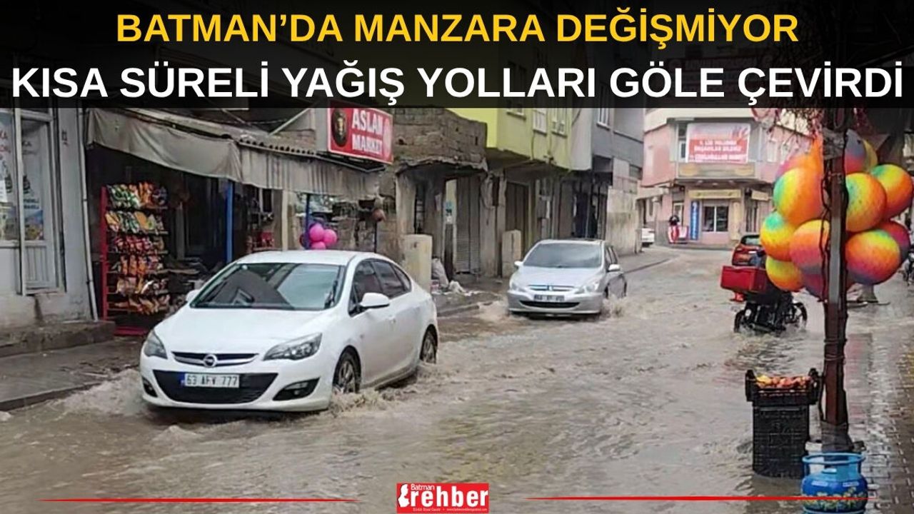 Batman’da her yağış sonrası tekerrür eden altyapı sorunu, bugün etkili olan kısa süreli sağanakla birlikte yeniden gün yüzüne çıktı. Kentin işlek noktalarından biri olan Petrol Caddesi, yoğun yağışın ardından sular altında kalarak adeta göle dönüştü.