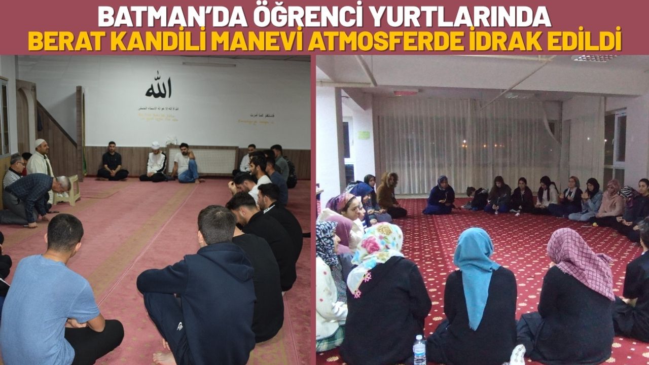 Batman Kız Öğrenci Yurdu’nda gerçekleştirilen program, Kur’an-ı Kerim hocası Ülkü Doğru’nun katılımıyla icra edildi. Kur’an-ı Kerim tilavetiyle başlayan gecede, kalplerin yumuşadığı manevi bir iklim oluştu. Programda Berat Kandili’nin anlam ve önemi üzerine sohbetler gerçekleştirilirken, öğrenciler hep birlikte ellerini semaya açarak dua etti.