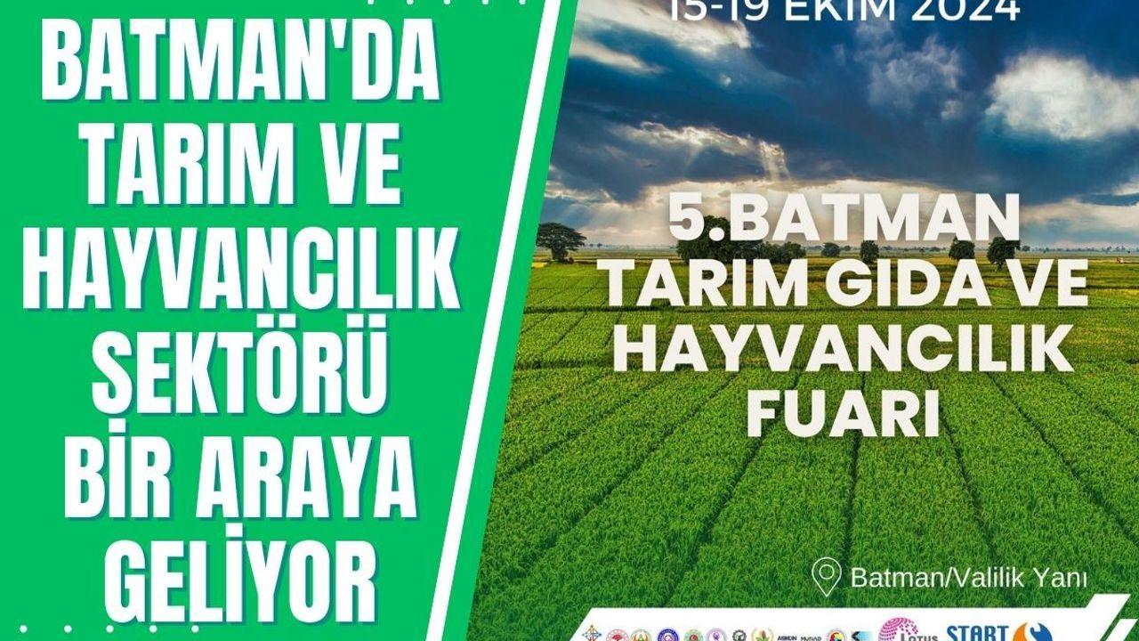 Tarım, gıda ve hayvancılık sektörünün nabzı 5 gün boyunca Batman'da atacak. 5. Batman Tarım Gıda ve Hayvancılık Fuarı, 15-19 Ekim 2024 tarihleri arasında Batman Valiliği yanındaki alanda düzenlenecek.