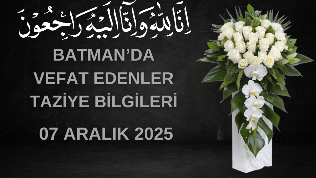 Batman'da hayatını kaybedenlerin taziye bilgileri. 07 Aralık 2025 Pazar günü itibariyle Batman'da vefat edenlerin taziyeleri ve taziyeler ile ilgili bilgiler.