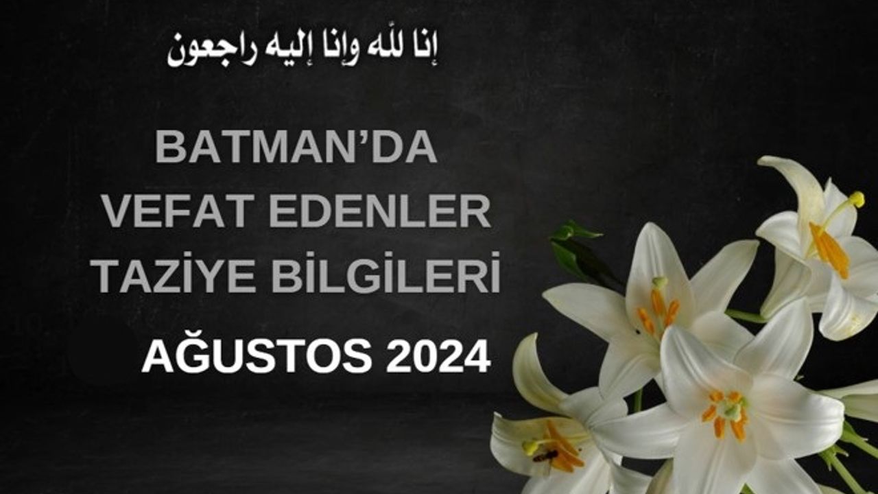 Batman'da hayatını kaybedenlerin taziye bilgileri. 10 Ağustos 2024 Cumartesi günü itibariyle Batman'da vefat edenlerin taziyeleri ve taziyeler ile ilgili bilgiler.