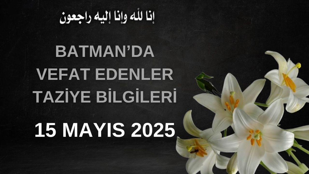 Batman'da hayatını kaybedenlerin taziye bilgileri. 15 Mayıs 2025 Perşembe günü itibariyle Batman'da vefat edenlerin taziyeleri ve taziyeler ile ilgili bilgiler.