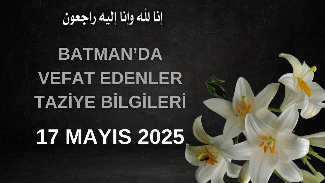 Batman'da hayatını kaybedenlerin taziye bilgileri. 17 Mayıs 2025 Cumartesi günü itibariyle Batman'da vefat edenlerin taziyeleri ve taziyeler ile ilgili bilgiler.
