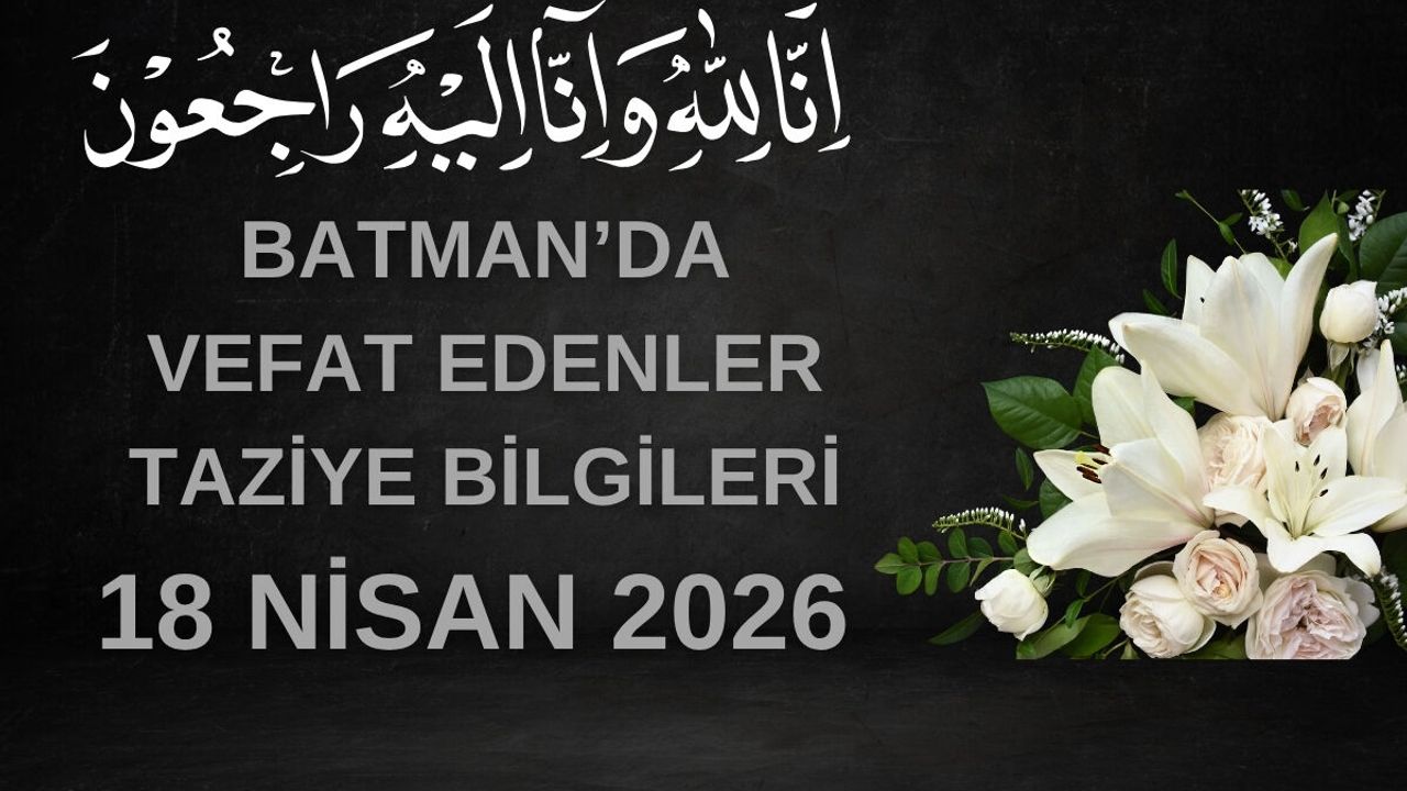 Batman'da hayatını kaybedenlerin taziye bilgileri. 18 Nisan 2026 Cumartesi günü itibariyle Batman'da vefat edenlerin taziyeleri ve taziyeler ile ilgili bilgiler.