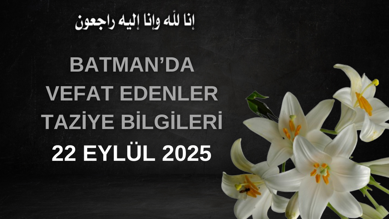 Batman'da hayatını kaybedenlerin taziye bilgileri. 22 Eylül 2025 Pazartesi günü itibariyle Batman'da vefat edenlerin taziyeleri ve taziyeler ile ilgili bilgiler.