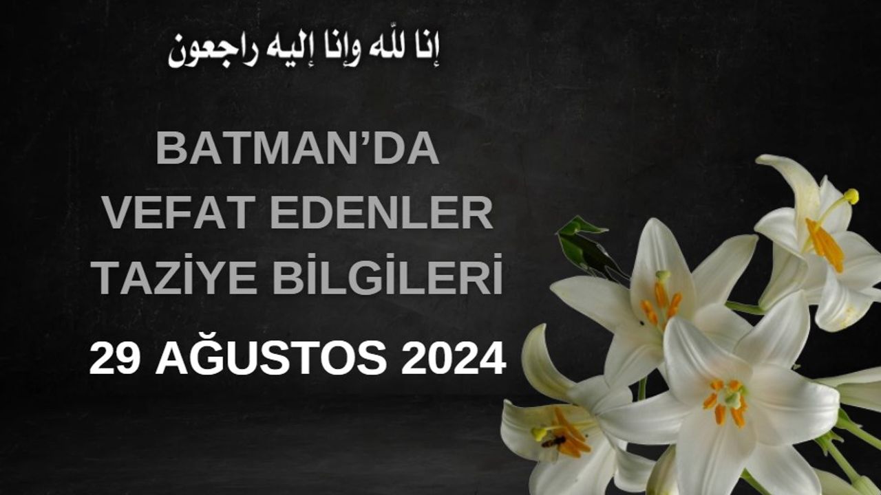 Batman'da hayatını kaybedenlerin taziye bilgileri. 29 Ağustos 2024 Perşembe günü itibariyle Batman'da vefat edenlerin taziyeleri ve taziyeler ile ilgili bilgiler.