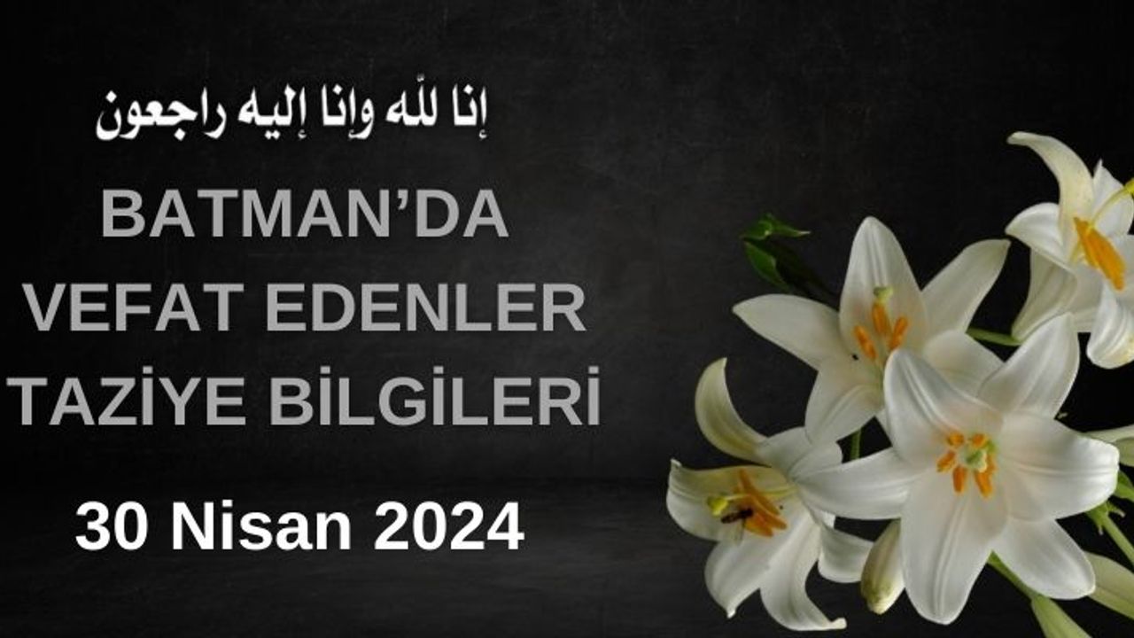 30 Nisan 2024 pazartesi günü itibariyle Batman'da taziyesi devam edenler ve taziyeleri ile ilgili bilgiler