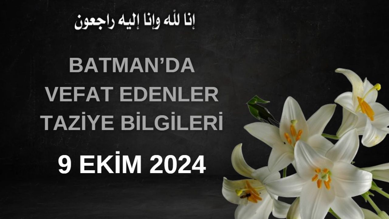Batman'da hayatını kaybedenlerin taziye bilgileri. 9 Ekim 2024 Çarşamba günü itibariyle Batman'da vefat edenlerin taziyeleri ve taziyeler ile ilgili bilgiler.