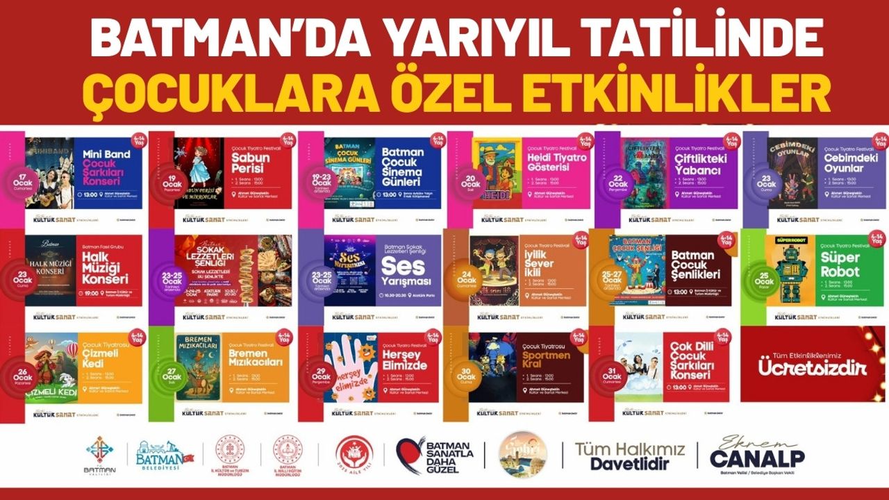 Dolu dolu geçecek yarıyıl tatili programı, 31 Ocak Cumartesi günü saat 13.00'te Ahmet Güneştekin Kültür ve Sanat Merkezi'nde gerçekleştirilecek "Çok Dilli Çocuk Şarkıları Konseri" ile sona erecek. Batman Valisi ve Belediye Başkan Vekili Ekrem Canalp'in "Tüm Halkımız Davetlidir" çağrısıyla duyurulan programdaki tüm etkinlikler ücretsiz olarak izlenebilecek.