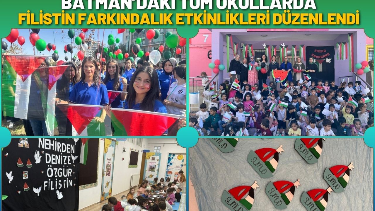 Millî Eğitim Bakanlığının genelgesi doğrultusunda, Batman genelindeki tüm okullarda “Filistin Farkındalık Etkinlikleri” düzenlendi. Öğrenciler, öğretmenler ve velilerin katılımıyla gerçekleştirilen etkinliklerde, Filistin halkına destek mesajları verildi.