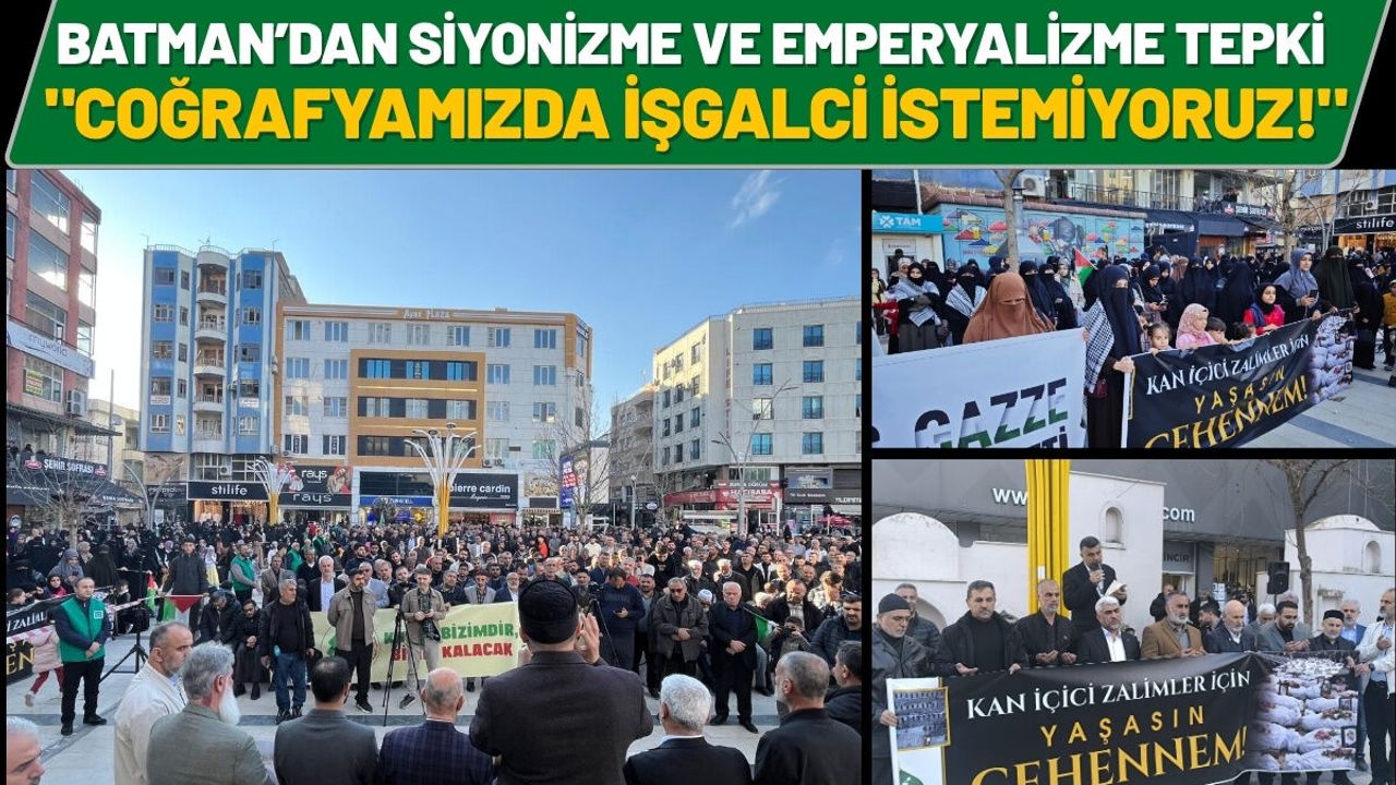 Batman’daki sivil toplum kuruluşları adına hazırlanan ortak metni Abdullah Özalp okudu. Coğrafyamızın sınırlarının kanla yeniden çizilmek istendiğine vurgu yapan Özalp, "İşgalci İsrail’in ve ona her türlü desteği veren ABD’nin uyguladığı ‘böl, parçala, yut’ politikalarını reddediyoruz. Kendi topraklarımızda ne siyonist işgalini ne de bölgeyi istikrarsızlaştıran Amerikan askeri varlığını istiyoruz," ifadelerini kullandı.