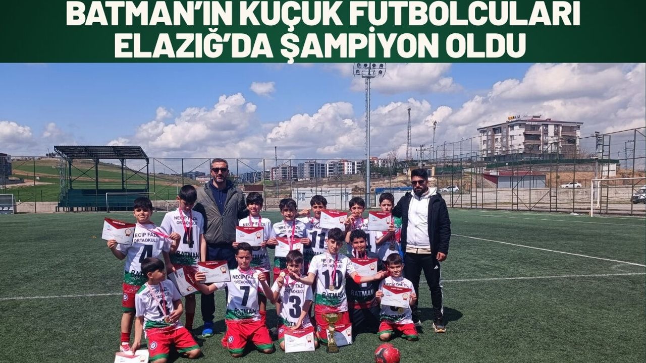 Batman Gençlik ve Spor İl Müdürlüğü’nün 2025-2026 faaliyet programı kapsamında Elazığ’da sahaya çıkan küçük futbolcularımız, 13-15 Nisan 2026 tarihleri arasında oynanan müsabakalarda fırtına gibi esti. Disiplinli oyun anlayışı ve pes etmeyen mücadele ruhuyla tüm rakiplerini mağlup eden Necip Fazıl Ortaokulu, turnuvayı zirvede tamamlayarak Batman’a büyük bir gurur yaşattı.