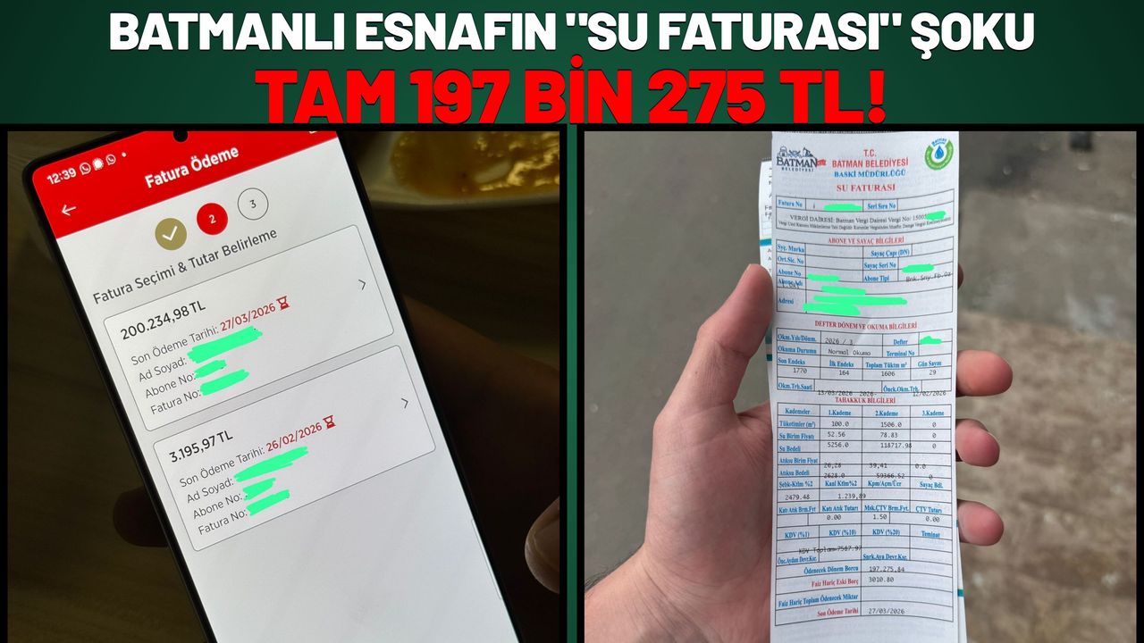 Batman kent merkezinde faaliyet gösteren bir esnaf, Batman Belediyesi BASKİ Müdürlüğü tarafından gönderilen Mart 2026 dönemine ait su faturasını görünce neye uğradığını şaşırdı. Ödenecek dönem borcu kısmında 197 bin 275 TL yazan faturayı gören vatandaş, durumu yetkililere bildirdi.