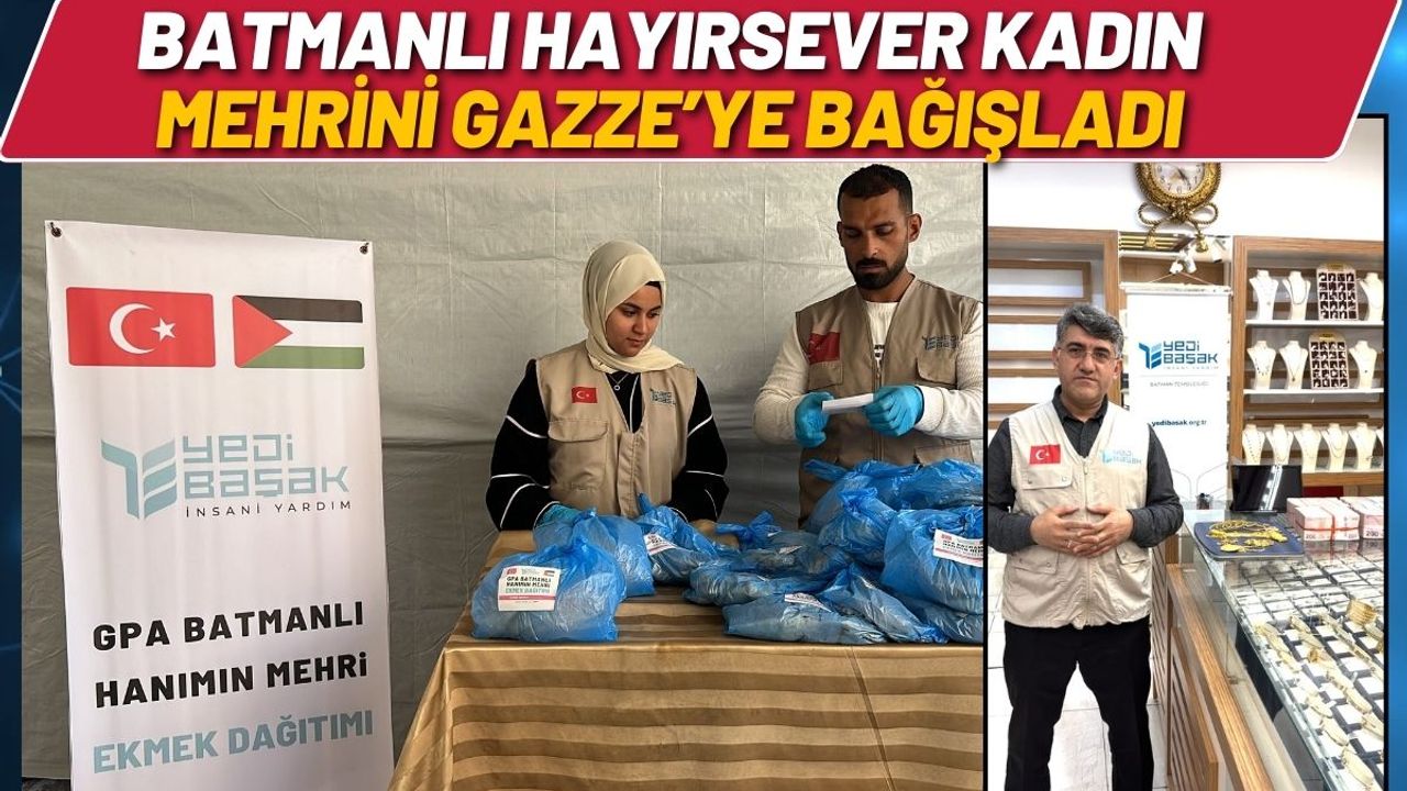 Yedi Başak İnsani Yardım Derneği Batman Temsilcisi Emrullah Aslan, yaptığı açıklamada Batmanlı duyarlı bir vatandaşın Gazze'de yaşanan insanlık dramına sessiz kalmayarak örnek bir davranış sergilediğini duyurdu. Evliliği için kendisine takdim edilen 1 milyon 410 bin TL değerindeki altın mehrini bağışlayan hayırsever kadın, bu anlamlı yardımı Yedi Başak İnsani Yardım Derneği aracılığıyla Gazze'deki ihtiyaç sahiplerine ulaştırdı.
