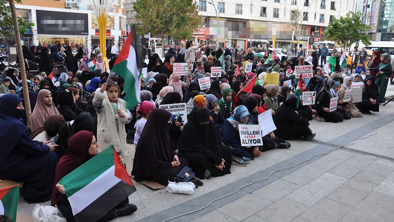 Gülistan Caddesinde Filistin bayrağı taşıyan kadın ve çocuklar, "israil sivilleri hedef alıyor", "Komutanı Muhammed olan bir ümmet boyun eğmez", "israil terör örgütüdür", "Çocukların gülmesi için bombalar susmalı, insanlık değil", "Filistin'de olanlara susmayın" yazan döviz ve pankartlar taşıyarak işgal rejimine tepki gösterdi.