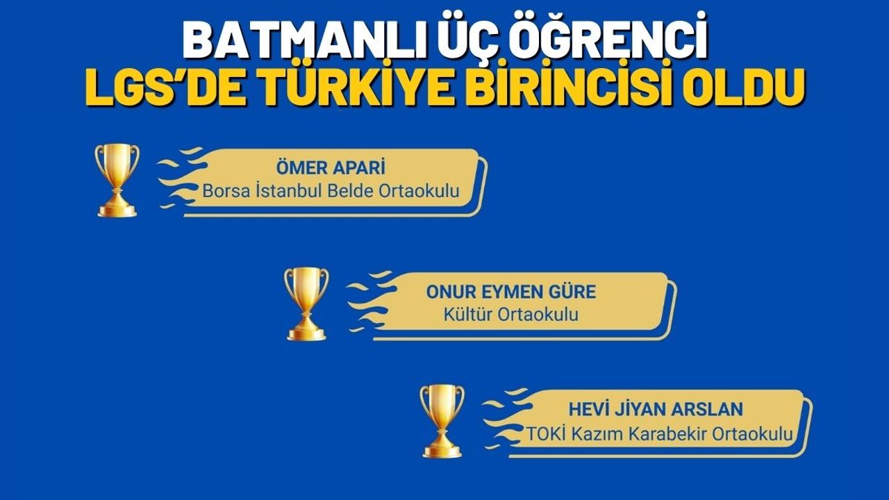 15 Haziran 2025 tarihinde gerçekleştirilen Liselere Geçiş Sistemi (LGS) sınavında Batman’dan üç öğrenci 500 tam puan alarak Türkiye birinciliğini elde etti. Borsa İstanbul Belde Ortaokulu öğrencisi Ömer Apari, Kültür Ortaokulu öğrencisi Onur Eymen Güre ve TOKİ Kazım Karabekir Ortaokulu öğrencisi Hevî Jiyan Arslan, Türkiye birinciliğini paylaştı.