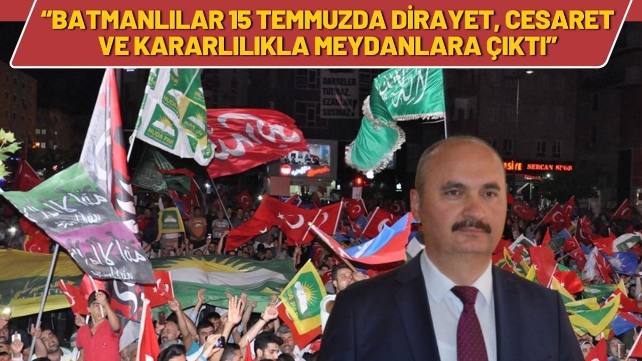 Batmanlıların da meydanlara çıkarak sürece destek verdiğini belirten Vali Canalp “Batmanlı hemşehrilerimiz de o karanlık gecede gösterdikleri dirayet, cesaret ve kararlılıkla meydanlarda devletine, bayrağına ve millet iradesine sahip çıkmış; bu kutlu mücadelenin onurlu bir parçası olmuşlardır.” dedi.