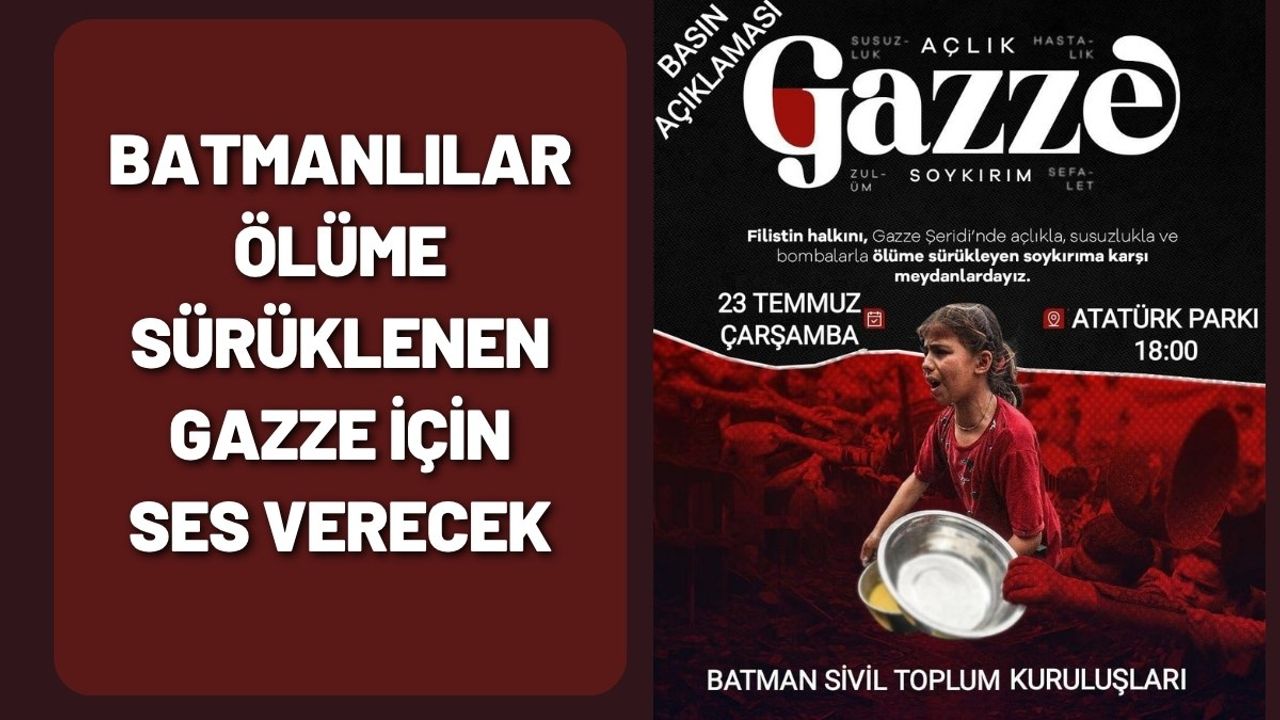 Batman Sivil Toplum Kuruluşları tarafından 23 Temmuz 2025 Çarşamba günü Saat 18.00’te Atatürk Parkı önünde düzenlenecek basın açıklamasında Batmanlı vatandaşlar, çocukların açlıktan öldüğü, hastanelerin bombalandığı, halkın susuz bırakıldığı Gazze için uluslararası kamuoyunun daha fazla duyarlılık göstermesi gerektiğini vurgulayacak. İsrail’in saldırılarının bir an önce durması ve ablukanın kaldırılması için Batman’dan güçlü bir ses yükselecek.