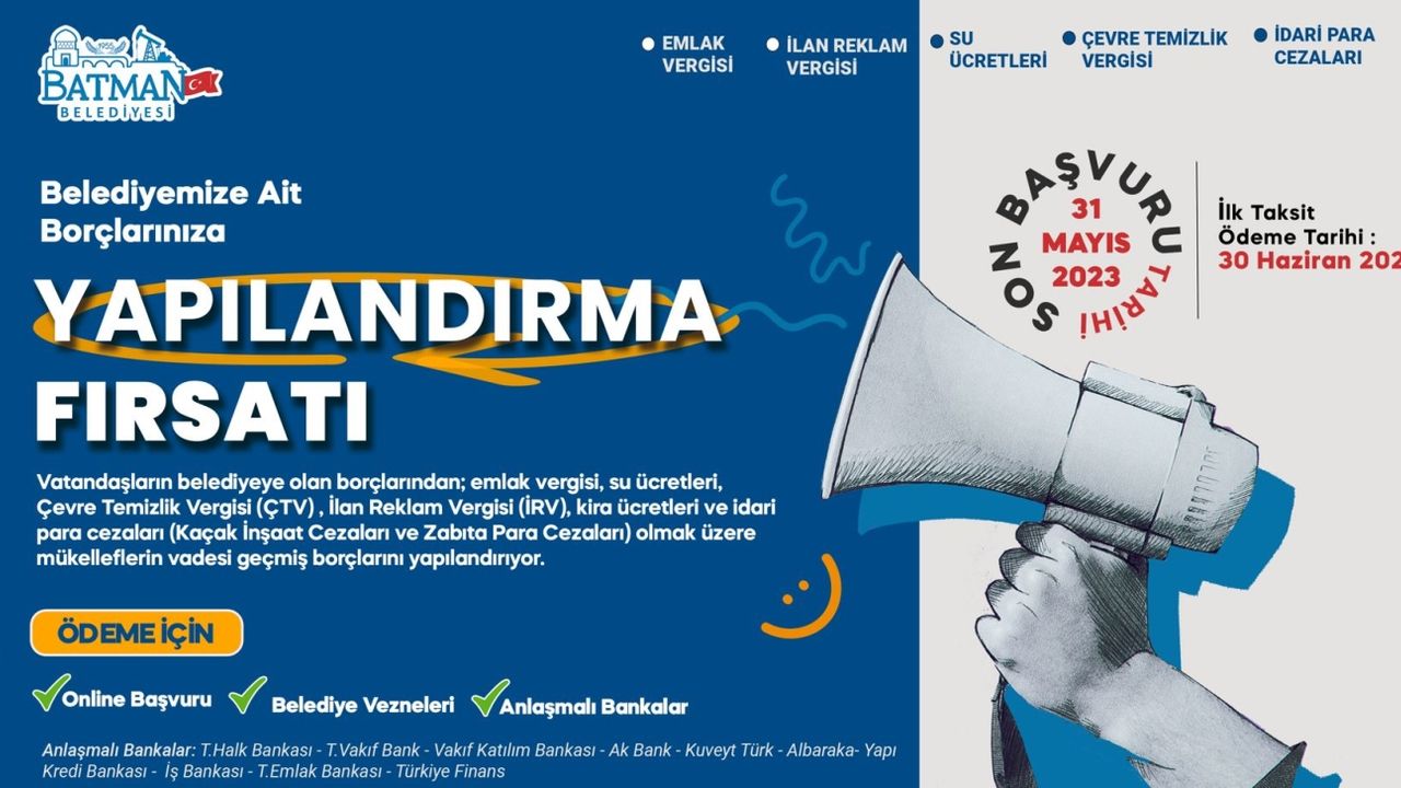Batman Belediyesi vatandaşların belediyeye olan borçlarından; emlak vergisi, su ücretleri, Çevre Temizlik Vergisi (ÇTV), İlan Reklam Vergisi (İRV), kira ücretleri ve idari para cezaları (Kaçak İnşaat Cezaları ve Zabıta Para Cezaları) olmak üzere mükelleflerin vadesi geçmiş borçlarını yapılandırıyor