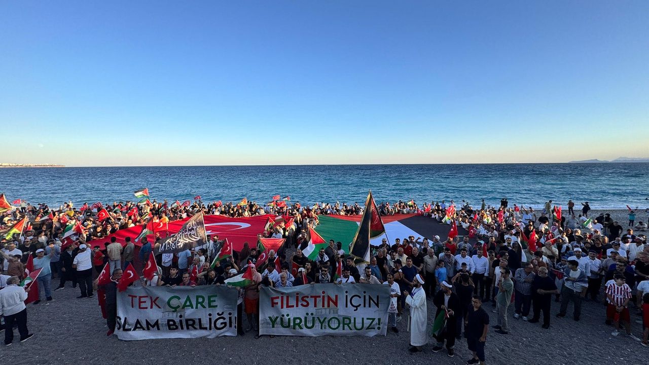 Sivil toplum kuruluşları, siyasi partiler ve çeşitli kesimlerden yoğun katılımın olduğu etkinlikte, ellerinde Filistin bayrakları bulunan binlerce kişi Konyaaltı Olbia Meydanı’nda toplandı.