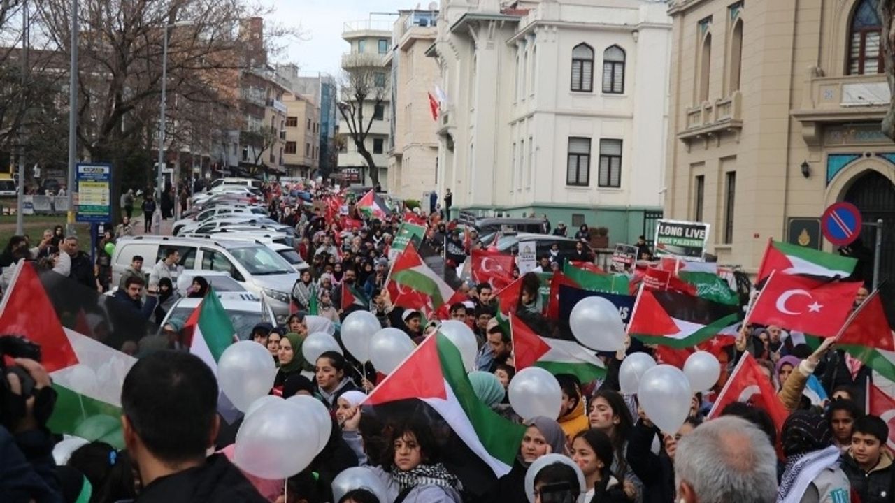 Fatih Camii'nde öğle namazına müteakiben aileleriyle birlikte bir araya gelen inlerce çocuk, ellerinde Filistin, Türkiye ve tevhit bayraklarının yanı sıra Gazze'de yaşanan katliamı kınayan, Filistin lehine yazılan pankart ve dövizlerle oluşturulan kortej eşliğinde Saraçhane Parkı'na kadar yürüdü.