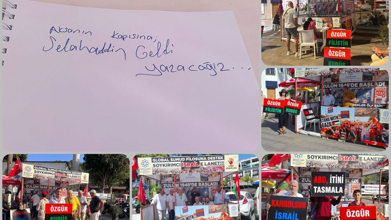 "Gazze'de süregelen insanlık dramına dikkat çekmek ve insani yardım malzemeleri taşıyan Sumud Filosu'na destek vermek amacıyla Bodrum İskele Meydanı'nda bir destek standı açmış bulunuyoruz. Filo Gazze'ye ulaşana dek, üyelerimiz ve gönüllülerimiz bu stantta dönüşümlü olarak nöbet tutacak, imza defteri ile halkımızın duyarlılığını kayıt altına alacağız. Ayrıca derneğimizin tanıtım broşürleriyle çalışmalarımızı kamuoyuna aktaracağız. Bizler inanıyoruz ki; sessiz kalmak, zulmü onaylamak anlamına gelir. Bodrum halkını insanlık onurunu savunmaya, Gazze halkının yanında olduğumuzu haykırmaya davet ediyoruz." (İLKHA)