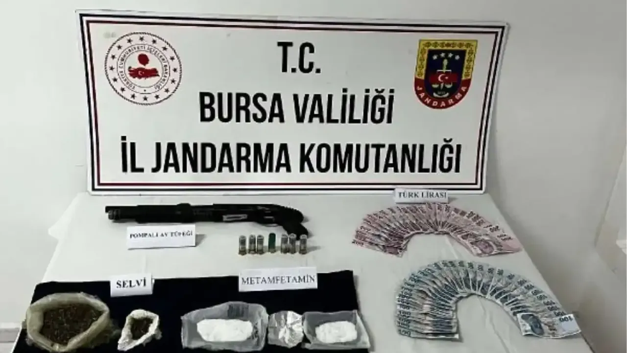 Jandarma ekiplerini görünce Y.K.'nın yere attığı poşette, 134 gram metamfetamin, 302 gram selvi, kısa sap pompalı tüfek, 7 adet 12 kalibre tüfek fişeği, 8 bin 700 TL ele geçirildi.