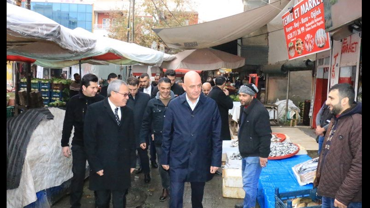 Batman Belediyesi'nin yürüttüğü 3. Etap Vizyon projesi, Cumhuriyet Meydanı Projesi, Gülistan Caddesi ve Çarşı merkezindeki çalışmaları yerinde inceleyen Batman Valisi Ahmet DENİZ ve Batman Belediye Başkan Vekili Ertuğ Şevket AKSOY, esnafla da sohbet etti.
