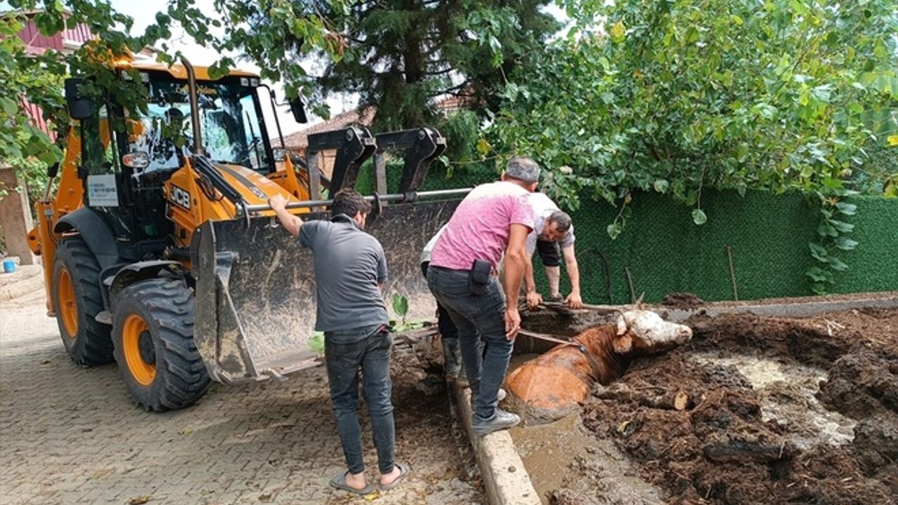 Saricaali Mahallesi'nde Rasim Coşkun'a ait inek, inşaat halindeki bir binanın yanındaki alanda çamura battı.