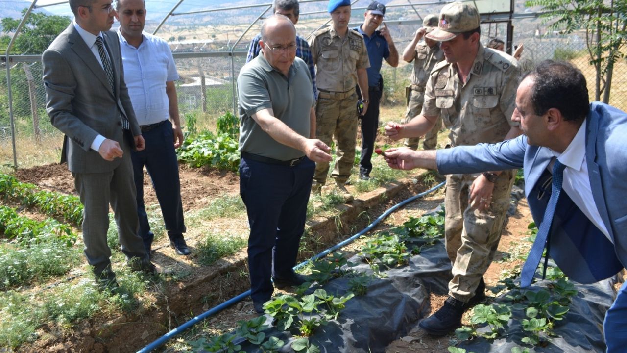 yöneticileriyle Sason İlçe Jandarma Komutanlığı bahçesinde yetişen çilekleri
