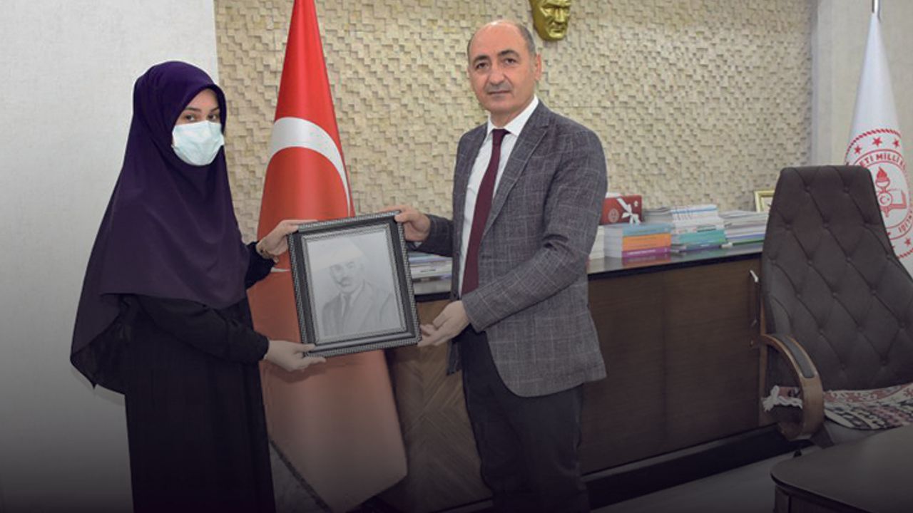 İstiklal Marşı'nın Kabulünün 100. yılı ve Mehmet Akif Ersoy yılı nedeniyle Milli Şairin karakalem portresini çizen ve kendisine hediye eden Mehmet Şimşek Anadolu İmam Hatip Lisesi 11. Sınıf Öğrencisi Reyyan NEHİR'e bu anlamlı hediye için teşekkür eden İl Milli Eğitim Müdürü KURTARAN, başarılı öğrenciye kitap hediye etti. ŞEVKİ ASLAN