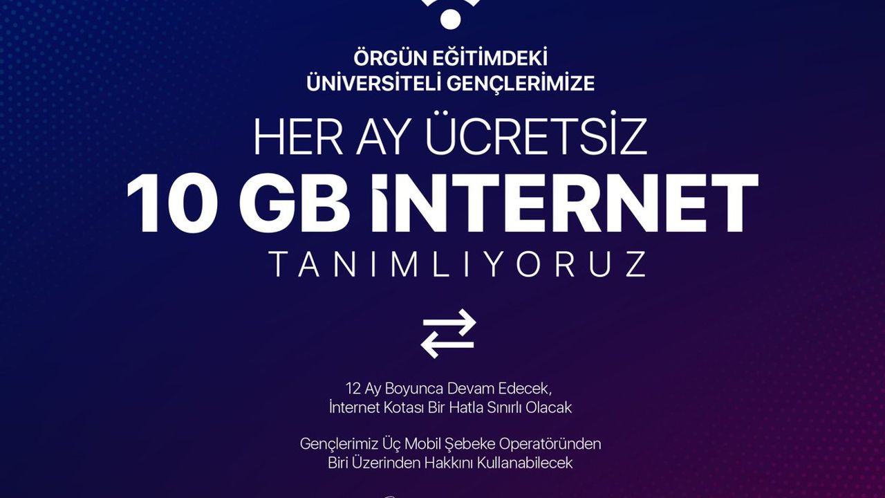 Teknoloji destek hamlesinden sonra öğrencilerin internet ihtiyacını karşılanması için ücretsiz internet dağıtılacağını resmi X hesabında paylaşan Cumhurbaşkanı, “Örgün eğitimdeki üniversiteli gençlerimizin bir hatla sınırlı olmak üzere mobil hatlarına 12 ay boyunca aylık ücretsiz 10 GB kota tanımlıyoruz. Gençlerimiz bu haklarını istedikleri üç mobil şebeke operatöründen biri üzerinden kullanabilecekler.” dedi.