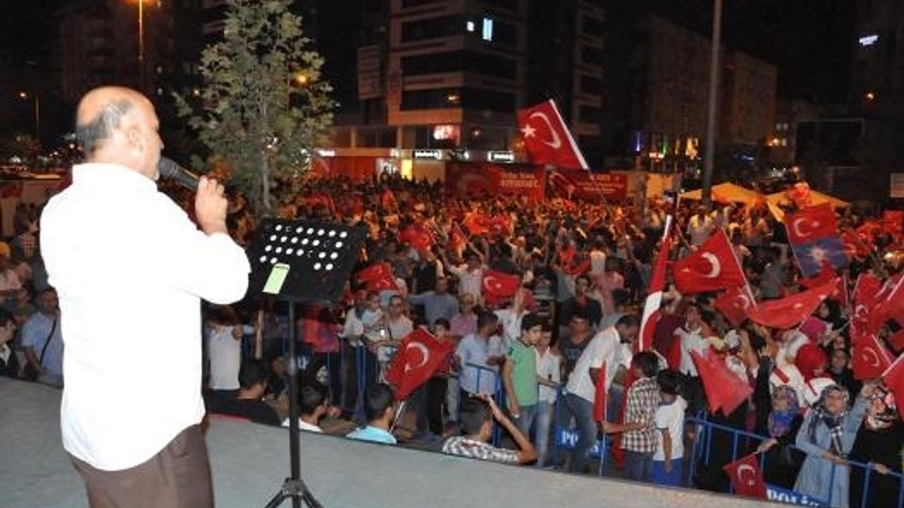 Meydanı ellerinde Türkiye bayrakları ile HÜDA PAR ve AK Parti flamalarının yanı sıra Tevhid bayraklarıyla dolduran binlerce vatandaş, Turgut Özal Bulvarı Valilik önünde attıkları sloganlarla darbe girişimine tepkisini yineledi.