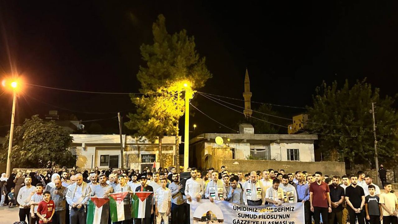 İşgal rejiminin Gazze ablukasını kırmak ve yardım ulaştırmak için yola çıkan Küresel Sumud Filosu'na destek için Dargeçit'te yürüşüş ve basın açıklaması etkinliği düzenlendi.