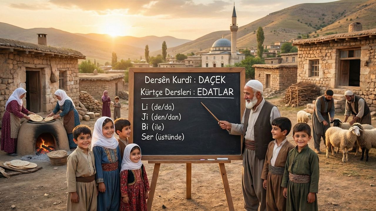 2- li: (Kürtçedeki bu edat da, Türkçedeki de ve da edatlarına benzer bir kullanıma sahiptir. Bu kullanım biçimi Kürtçedeki de …da kullanımından farklı olarak, daha çok ‘gözle görülür, açıkta’ anlamlarında kullanılır.)