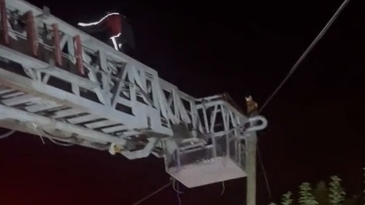 Şırnak'ın Silopi ilçesinde çıktığı internet direği üzerinde mahsur kalan kediyi itfaiye ekipleri kurtardı.