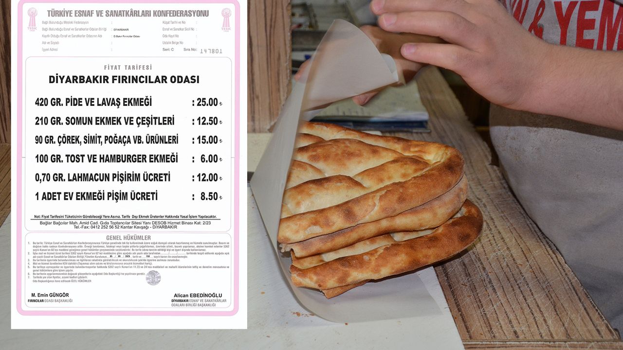 400 gram pide ve lavaş ekmeği: 20 TL, 200 gram somun ekmek ve çeşitleri: 10 TL, 180 gram yağlı ekmek ve çeşitleri: 25 TL, 90 gram simit, çörek, poğaça vb.: 12 TL, 100 gram tost ve hamburger ekmeği: 5 TL, 0,70 gram lahmacun pişirme ücreti: 10 TL ve bir adet ev ekmeği pişirme ücreti: 7 TL iken Diyarbakır Fırıncılar Odası'nın kararıyla fiyat listesi şöyle güncellendi: