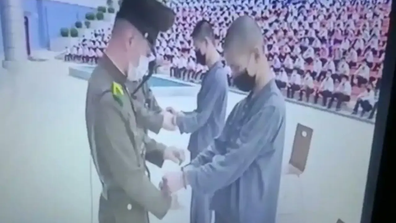Güney Kore dizisi izledikleri belirtilen yaşları 16 olan iki gence, açık hava stadyumunda yüzlerce öğrencinin önünde kelepçe takıldı. Ayrıca memurlar, "hataları üzerinde derinlemesine düşünmedikleri" için geçleri azarladıkları da ifade edildi.