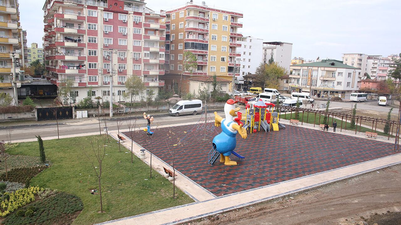 kurulan parkta çocuk oyun gurubu, oturma bankları, yürüyüş yolu ve dinlenme