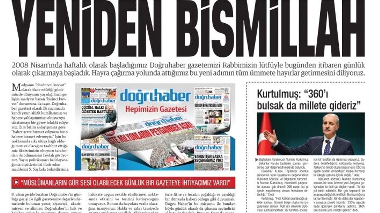 Nisan 2008'den bu yana haftalık olarak yayınlanan Doğruhaber Gazetesi, dün (1 Kasım 2016) itibariyle günlük yayına başladı. İlk günlük sayısında 'Yeniden Bismillah' manşetiyle çıkan Doğruhaber'e, Biz Batman Rehber Gazetesi ve çalışanları olarak Canabı Allah'tan yeni yayın hayatında başarılar dilerken, manşetten aktarılan Gazetenin yayın politikalarını sizlerle paylaşıyoruz:
